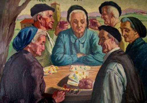 “Pareak bai!!!”, botatzen du eskutik doanak “i” hori azpimarratuz. “Ederrak”, erantzuten du bigarrenak irribarre txiki batekin ezpainetan. “Triunforako” botatzen du hirugarrenak jendeari beldurra sartu nahian. Laugarrenak zorrotz begiratu bere kartei eta serio demonio esaten du: “Enbido txikira”.